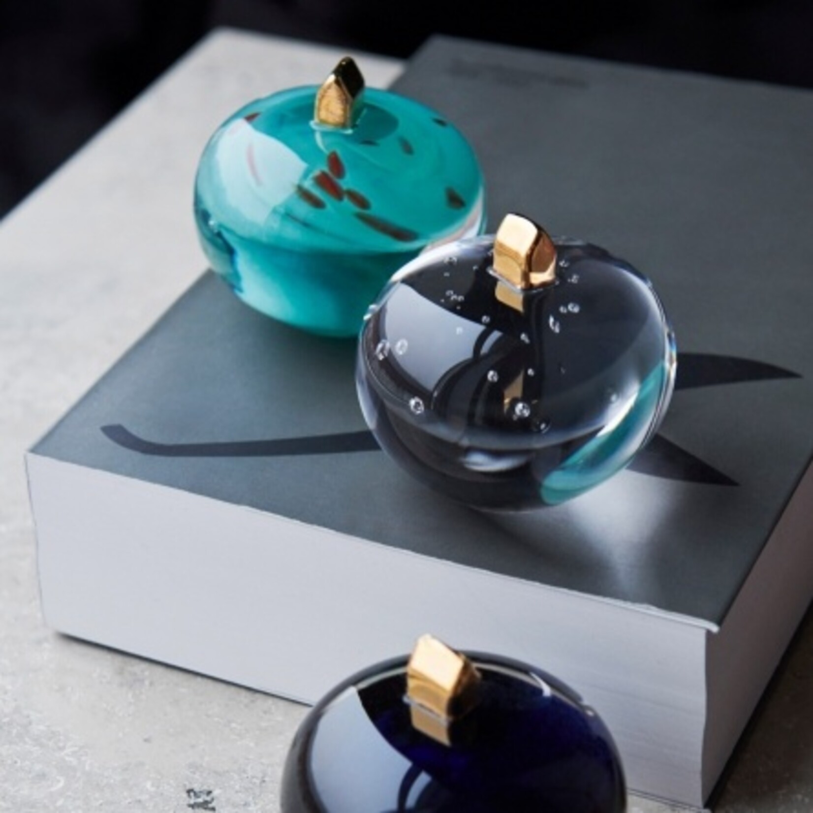 De Kosta Boda sculptuur Ocean van Bertil Vallien gemaakt van diepblauw zuiver kristal heeft een hoogte van circa 7 cm. Bovenop staat een goudkleurig kristallen huisje, wat het kunstwerk een elegante en symbolische uitstraling geeft. Handgemaakt in Zweden.
